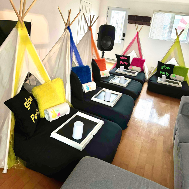 - Nombre de tipis : Louez de 1 à 6 tipis, chacun décoré avec un tulle décoratif et une guirlande lumineuse (lumières UV pour le forfait « glow in the dark ») pour une ambiance chaleureuse.